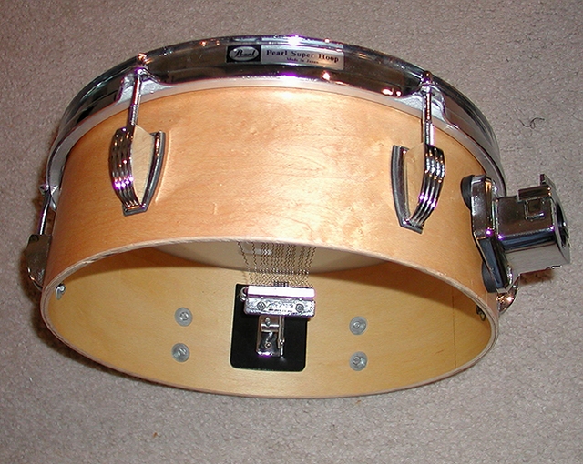 Here's my snare drum. It's a 4x12 thin maple shell from Resurrection Drums, with only ONE head, equipped with a set of snares harvested from an old Purecussion Headset.